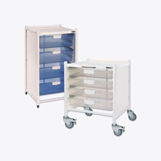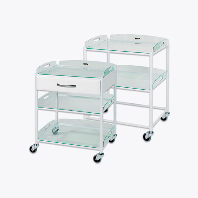 Clinic trolleys offering useful storage solutions with a variety of sizes and trays.