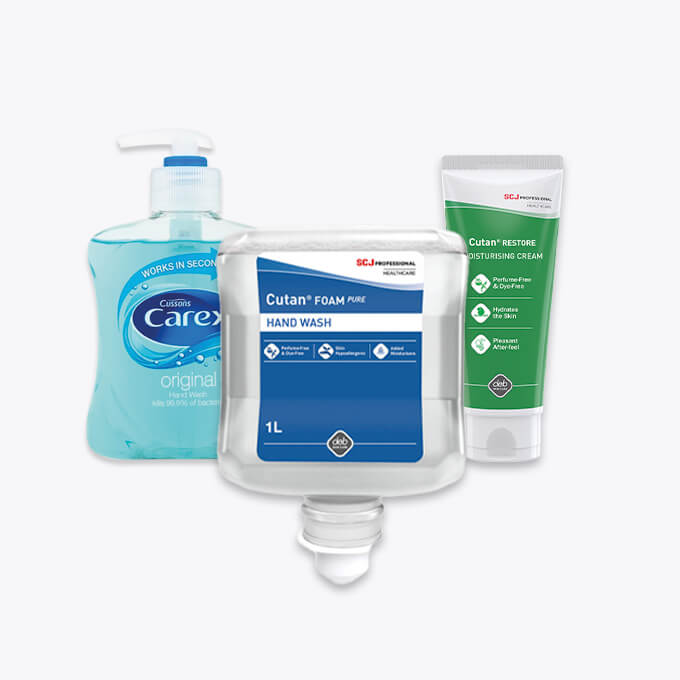 Our range of convenient and high-performance systems and hand sanitisers from Tork, Purell, Gojo and Cutan are suitable for clinical and public areas.